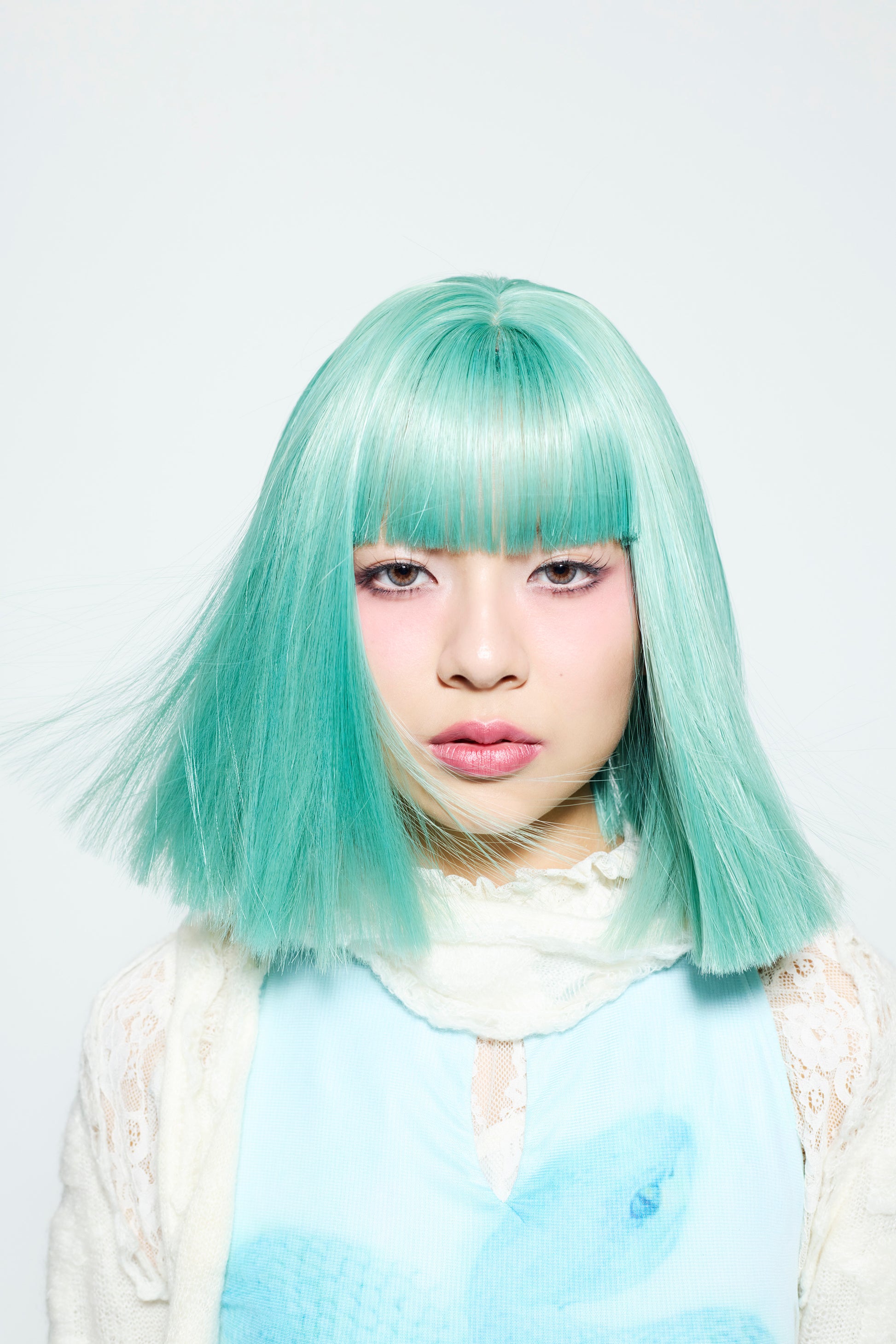 ターコイズのような青色。パッツンボブ。